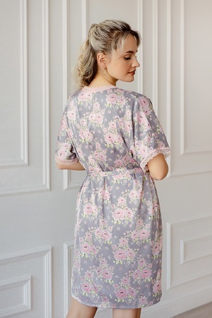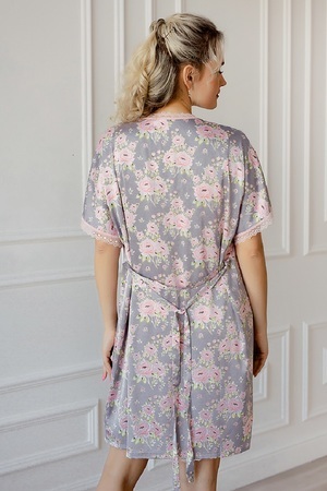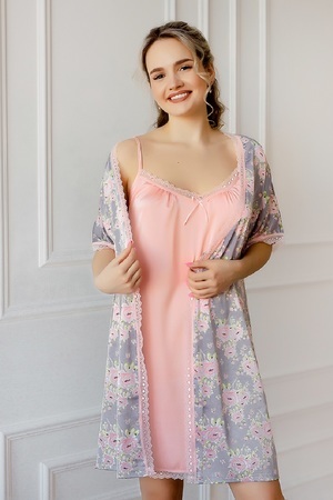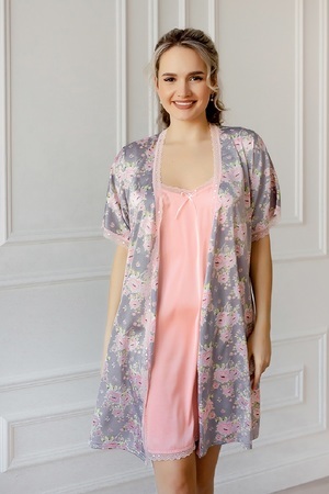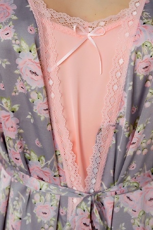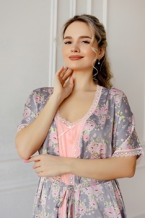 Шелковый изысканный домашний пеньюар для женщин. Комплект состоит из сорочки и халата. Халат с набивным рисунком, запашной, длинной до колена с застежкой на полудержатель и пояс. Рукава и горловина халата декорированы эластичным кружевом. Сорочка из однотонного шелка, полуприлегающего силуэта, длинною до колена, на тонких регулируемых бретелях. Горловина полочки и низ сорочки оформлен кружевом в цвет изделия.