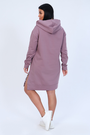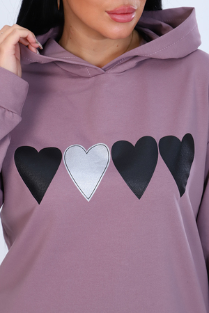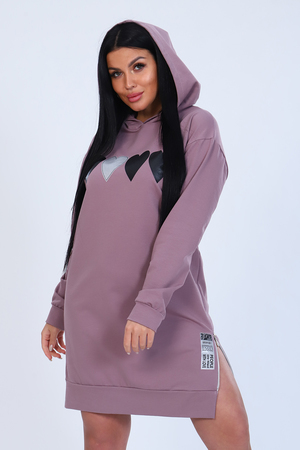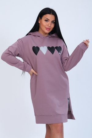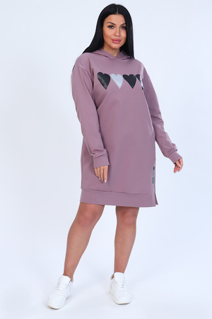 Туника женская из мягкого футера с лайкрой 2-х нитка, качества карде. Модель с капюшоном, спущенная пройма, длинный рукав и низ туники обработаны широким манжетом. На передней полочке стильный принт в виде сердец и в виде шеврона внизу, в боковом шве функциональная декоративная молния. Модное, уютное платье отличный вариант офисного гардероба для современной деловой девушки.