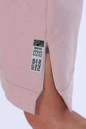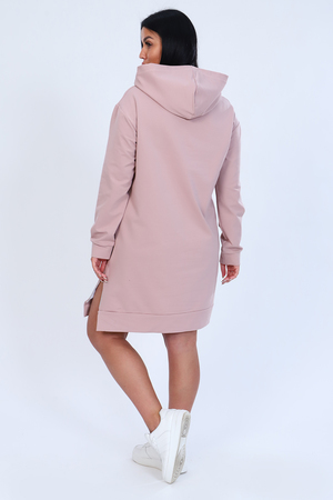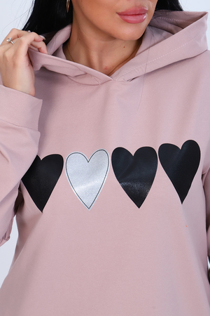 Туника женская из мягкого футера с лайкрой 2-х нитка, качества карде. Модель с капюшоном, спущенная пройма, длинный рукав и низ туники обработаны широким манжетом. На передней полочке стильный принт в виде сердец и в виде шеврона внизу, в боковом шве функциональная декоративная молния. Модное, уютное платье отличный вариант офисного гардероба для современной деловой девушки.