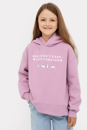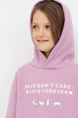 Комфортное расслабленное худи для девочек. Выполнено из легкого трикотажного футера. Прямой силуэт, длинные рукава на широких манжетах, уютный капюшон – ничего лишнего. Особый комфорт дарит спущенная линия плеча. Девочке наверняка понравится оформление этого худи и надпись "Boys don't care – cats forever".