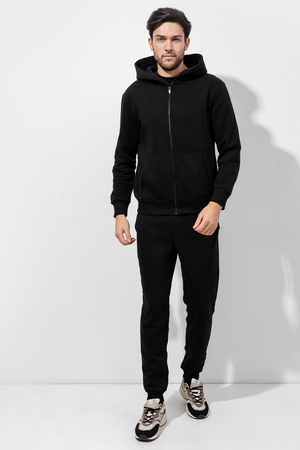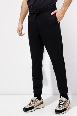 Стильные мужские брюки-джоггеры из трикотажного футера с теплым подчесом. Силуэт зауженный, штанины с манжетами. Есть удобные боковые карманы. В поясе – эластичная тесьма и шнурок-затяжка. Просто, комфортно, актуально!