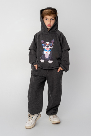 Костюм из мягкого футера двунитки. Свободный крой, стильная худи с капюшоном, прямые брюки с боковыми карманами. Подходит для прогулок, садика, а также для дома. Легкий в уходе, после стирки не деформируется и не пилингуется.