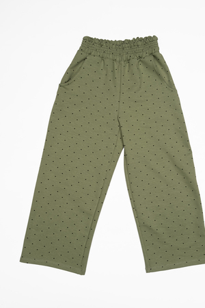 Брюки выполнены из набивного футера. Прямая посадка и резинка на талии позволят ребенку чувствовать себя комфортно во время любых телодвижений. Модный узор в горошек позволит ему выглядеть стильно, а также станет лаконичным дополнением к футболке или лонгсливу.
