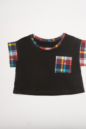 Черная футболка с клетчатыми элементами. Сшита из кулирки, которая отличается своим комфортом и легкостью в уходе. Футболку можно комбинировать со многими вещами гардероба девочки.