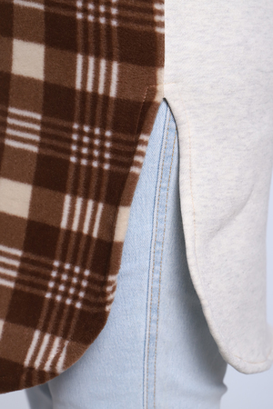 Ткань приятная и мягкая. Сочетание 2х цветов смотрится не плохо. Сиреневая клетка спереди и однотонная серая ткань сзади. Маломерит на размер, так как бедра у меня 52 обтянула. Но решила оставить вдруг похудею:)))))