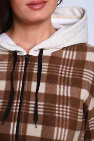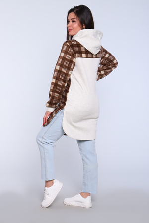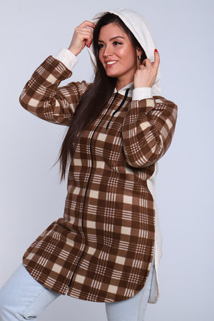 Туника женская прямого силуэта на молнии, с капюшоном на шнуровке через люверсы. Длинный рукав на манжете. Закругленный низ  полочек.
