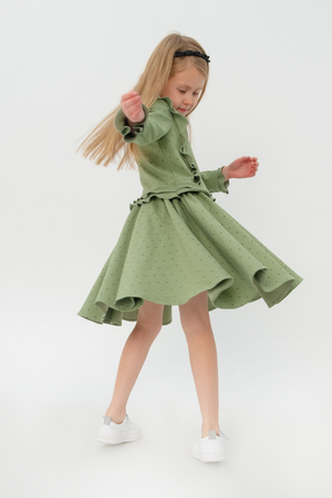 Костюм состоит из лонгслива и юбки, которые имеют узор в мелкий темный горошек. Выполнен из набивного футера, который легок в уходе и стирке. Костюм подойдет как для повседневной носки, так и для особых дней.