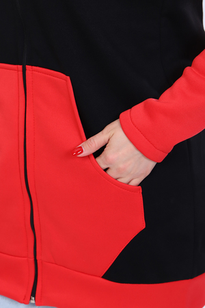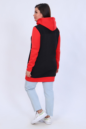 Женская комбинированная туника прямого силуэта на молнии, с капюшоном на шнуровке через люверсы. Длинный рукав на манжете. Карман "кенгуру". Теплая и удобная. Рост модели на фото 165см, размер 48