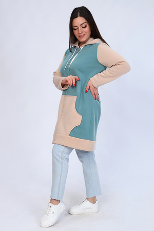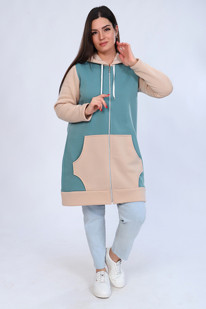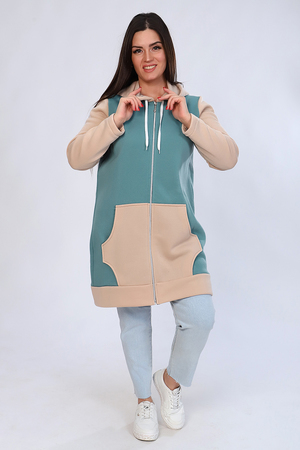 Женская комбинированная туника прямого силуэта на молнии, с капюшоном на шнуровке через люверсы. Длинный рукав на манжете. Карман "кенгуру". Теплая и удобная. Рост модели на фото 165см, размер 48