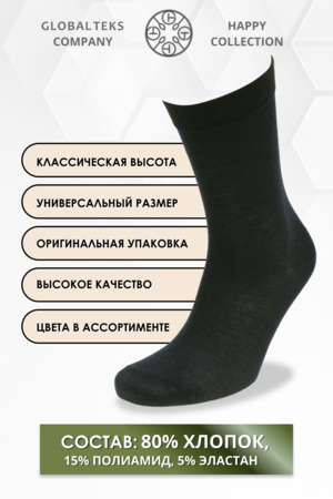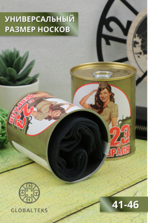 Внутри банки носки мужские 1 пара, состав 80% хлопок, 15% полиамид, 5% эластан, универсального размера 41-46. Использование высококачественного материала позволяет коже "дышать", а добавление небольшого количества синтетических нитей делает носки долговечней.