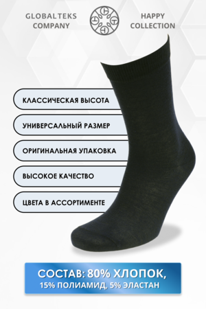 Внутри банки носки мужские 1 пара, состав 80% хлопок, 15% полиамид, 5% эластан, универсального размера 41-46. Использование высококачественного материала позволяет коже "дышать", а добавление небольшого количества синтетических нитей делает носки долговечней.