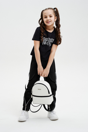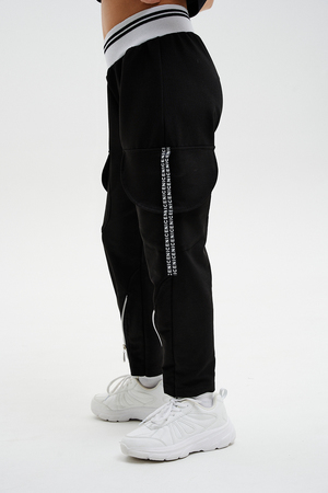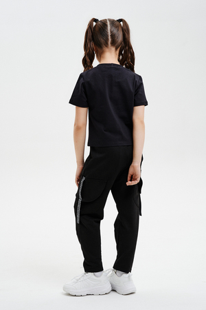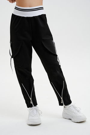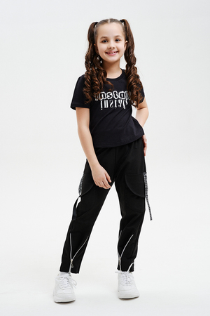 Брюки детские для девочек, свободного силуэта с накладными карманами и декоративной тесьмой. Пояс выполнен из широкой эластичной рибаны, низки брюк обработаны функциональными молниями.