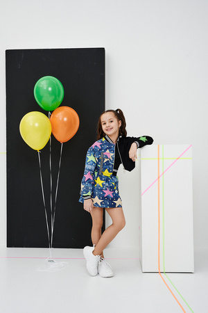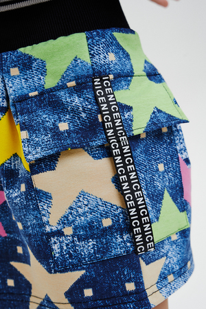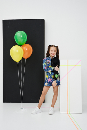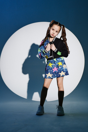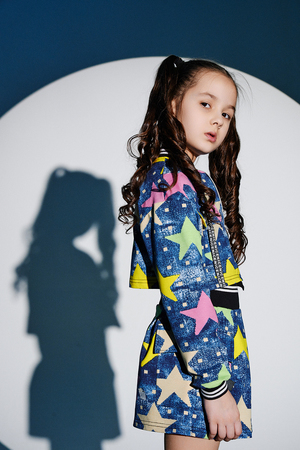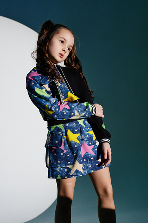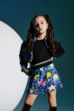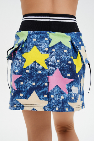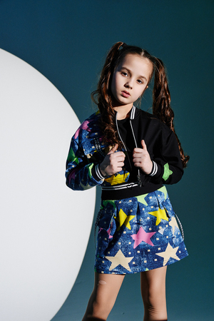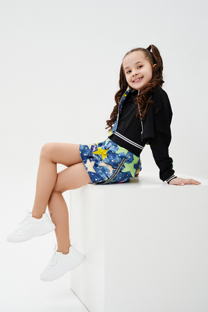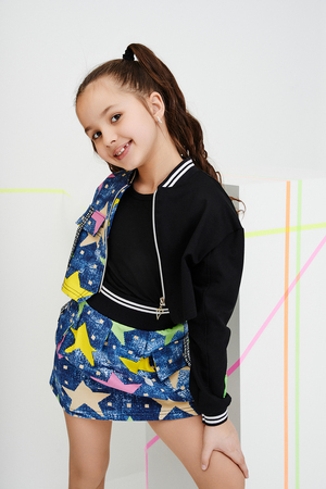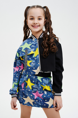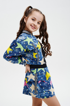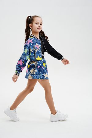 Костюм детский для девочек, состоит из укороченного бомбера с застежкой на молнию и накладным нагрудным кармашком с клапаном. Горловина и низ рукавов обработаны эластичной рибаной. Рукав бомбера оформлен ярким декором в форме звезды. Юбка свободного силуэта с широкой эластичной резинкой на поясе, с накладными боковыми карманами оформленными декоративными яркими звездами.