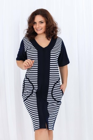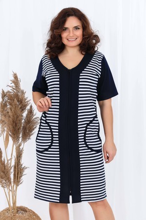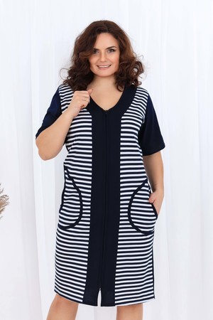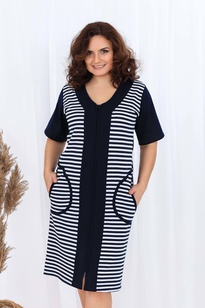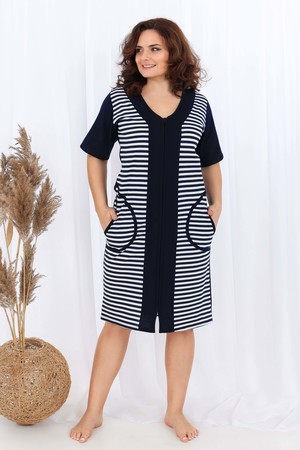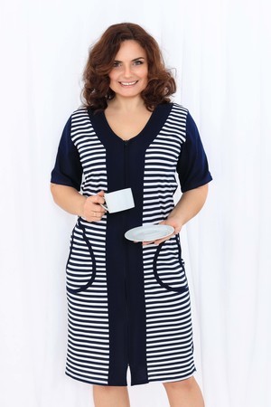Халат домашний женский, с застёжкой на молнии, рукав короткий, в боковых швах два полупояса. Размерный ряд имеет большие размеры. Халат из 100% хлопка.