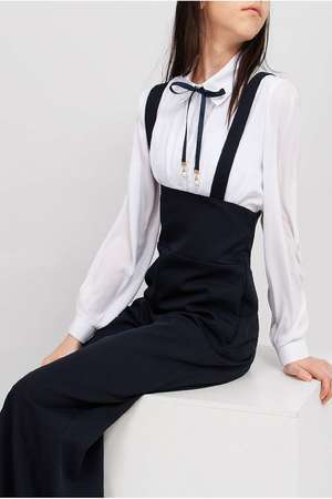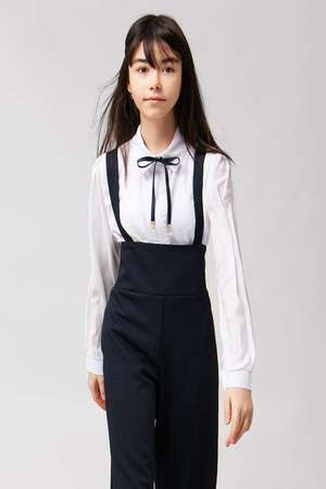 Элегантная юбка - брюки, для девочки. Модель с высокой посадкой, дополнена съёмными бретелями на пуговицах, в пояс вшита резинка. Гармонично сочетается с разнообразными блузками, водолазками и джемперами. Такая вещь непременно подчеркнет индивидуальный стиль юной модницы, и разнообразит ее повседневный школьный образ.