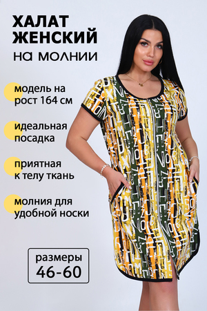 Женский домашний халат подойдет как женщинам, так и девушкам, независимо от возраста и особенностей фигуры. Выбираясь из постели, ходить по дому в таком халате очень приятно. Халат на молнии - один из самых практичных вариантов. Он не будет распахиваться во время занятия домашними делами. Кроме того, халатик можно использовать в качестве летнего платья для дачи или пляжного отдыха. Сделайте первый шаг на пути к комфортному отдыху! Рост модели на фото 164 см, размер 48