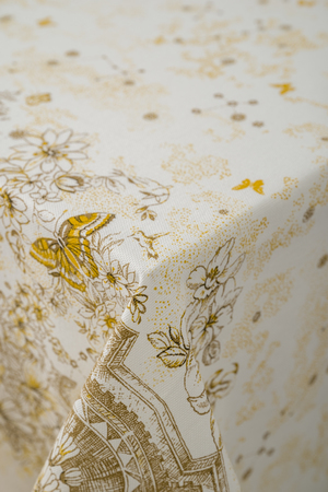 Светлая скатерть с изысканным рисунком в стиле Диор, способна украсить даже самую необычную кухню. Золотистые узоры и бабочки на белом фоне выглядят очень лаконично и дорого, особую утонченность дизайну придают предметы античности. Скатерть из рогожки Диор практичная, долговечная и элегантная.