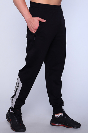 Брюки мужские из прочной, дышащей, приятной к телу ткани. Пояс на резинке дополнен шнурком с внутренней стороны. Боковые врезные карманы на молнии, у кармана печать-логотип с буквенной надписью. По боковому шву вниз от колена расположена вставка из контрастной ткани с печатью. Низ брюк на манжете из кашкорсе. Брюки подойдут для активного отдыха, занятий спортом и просто прогулок.