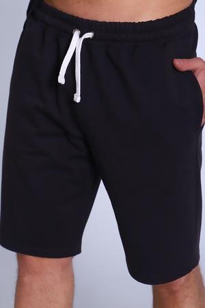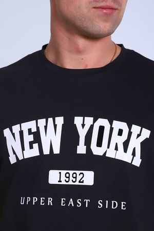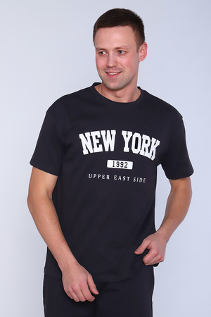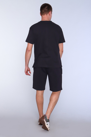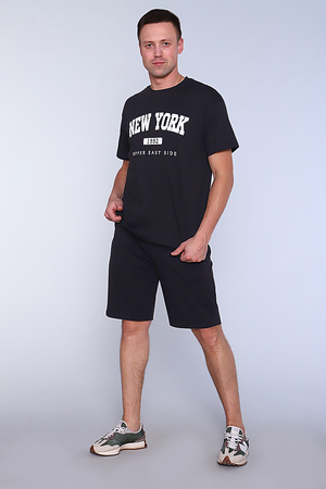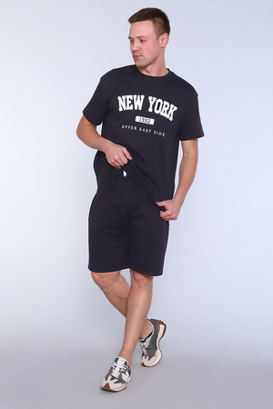 Костюм мужской, состоит из футболки и шорт. Футболка свободного силуэта, с втачным коротким рукавом. На полочке принт. Горловина округлой формы, обработана обтачкой. По горловине спинки - усилитель, из киперной летны. Низ изделия и рукав подогнут. Шорты свободного силуэта, с карманом в боковом шве. Пояс широкий, с люверсами и шнуром. Низ изделия подогнут.