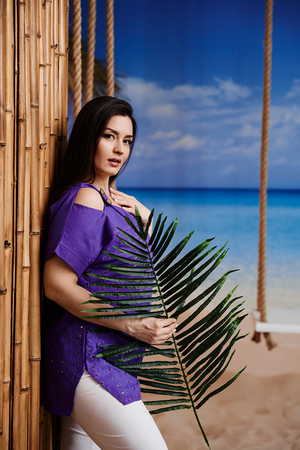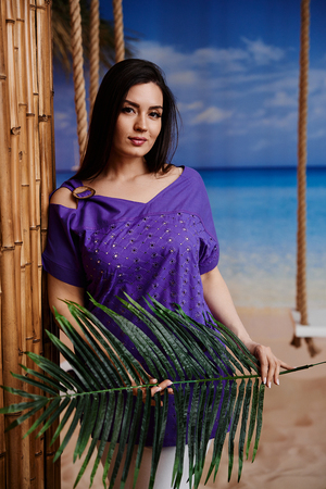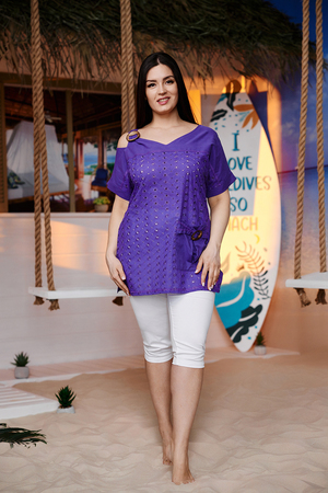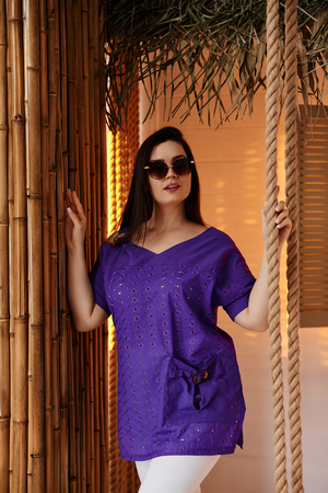 Туника женская, полуприлегающего силуэта. Вырез асимметричный, с одной стороны бретель с кокосовой пуговицей. На полочке и спинке кокетка из отделочной ткани. Рукав цельнокроеный до локтя на манжете. На полочке накладной карман со складкой и декоративной пуговицей.