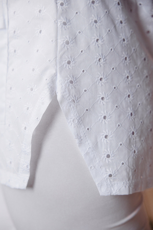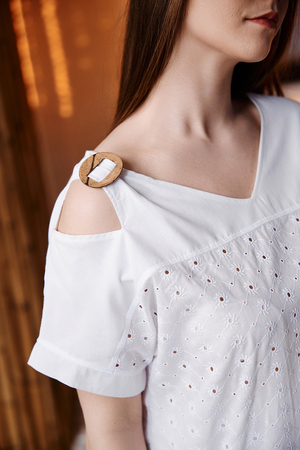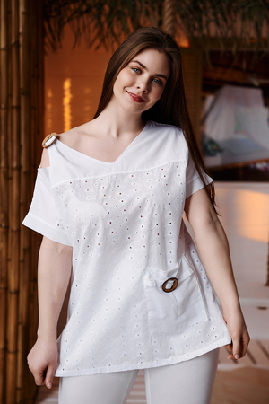 Туника женская, полуприлегающего силуэта. Вырез асимметричный, с одной стороны бретель с кокосовой пуговицей. На полочке и спинке кокетка из отделочной ткани. Рукав цельнокроеный до локтя на манжете. На полочке накладной карман со складкой и декоративной пуговицей.
