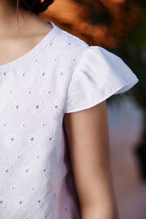 Платье детское, расширенное к низу. Рукав "крылышко". Горловина округлая, сзади завязки. Три яруса платья из тканей компаньонов. Платье из шитья, в состав которого входит 100% хлопок, ткань комфортна и гигроскопична.