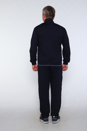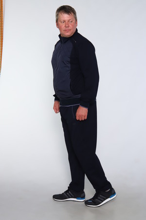 Мужской спортивный костюм. Ветровка на молнии, два боковых кармана также на молнии, воротник - стойка, рукава и низ кофты на манжете, спереди вставка из плащевки. Брюки прямого кроя, пояс на резинке, два боковых кармана на молнии с вставкой из плащевки. Также имеется на кофте и брюках декоративная вышивная эмблема. Приятная к телу ткань, не скатывается и не теряет форму. Костюм подойдет для спорта, для повседневной носки, для дачи.