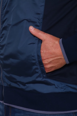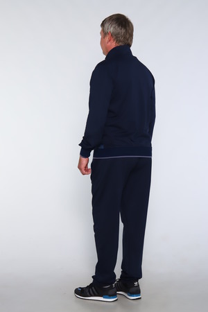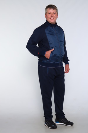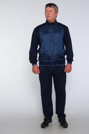 Мужской спортивный костюм. Ветровка на молнии, два боковых кармана также на молнии, воротник - стойка, рукава и низ кофты на манжете, спереди вставка из плащевки. Брюки прямого кроя, пояс на резинке, два боковых кармана на молнии с вставкой из плащевки. Также имеется на кофте и брюках декоративная вышивная эмблема. Приятная к телу ткань, не скатывается и не теряет форму. Костюм подойдет для спорта, для повседневной носки, для дачи.