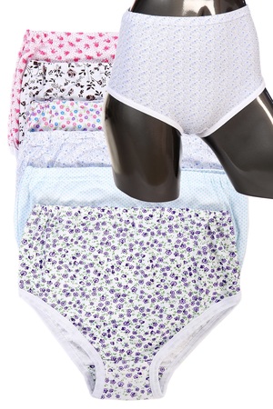 Трусы женские из кулирки. Три штуки в упаковке. Цветочный узор, белая окантовка, на резинке, несколько вариантов расцветки. Размеры от 48 до 62. Внимание, данный товар не подбирается по цветам и не продается в розницу!