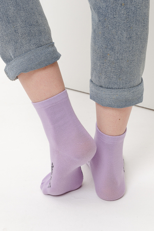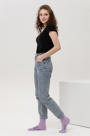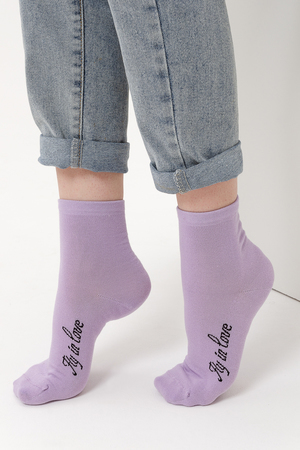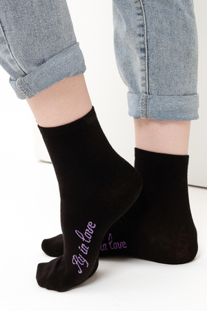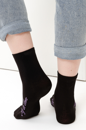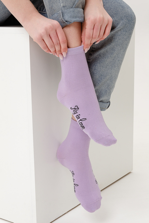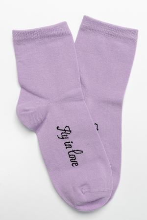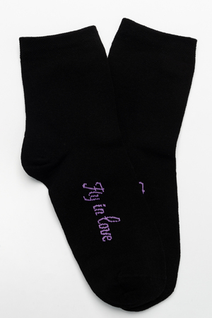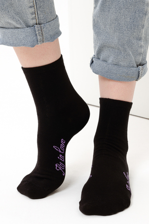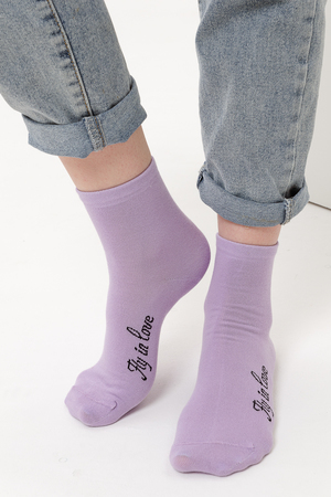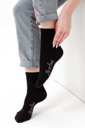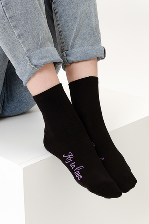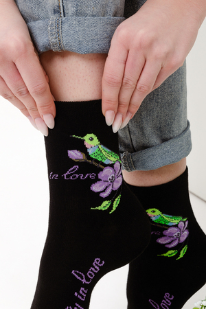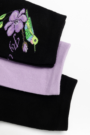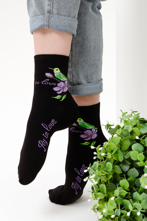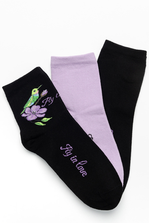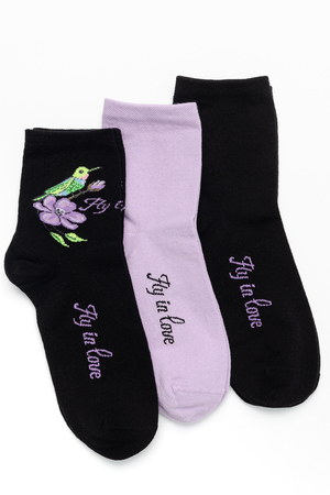 Весенний комплект женских носков с изображением птички колибри. В упаковке 3 пары - 1 черная пара с рисунком, 2 пары - сиреневая и черная с надписью