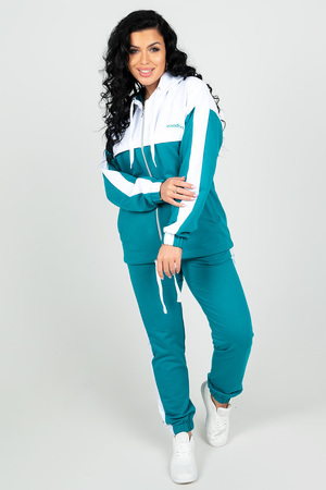 Спортивный женский костюм состоит из толстовки и брюк. Толстовка свободного силуэта на молнии, с удобными прорезными карманами с листочкой. Спущенная линия плеча, длинный рукав с манжетой на резинке. Белая отделка двойного капюшона, кокеток, полочки и спинки, лампасы рукавов и брюк придают костюму яркость и оригинальность. Брюки с боковыми карманами, низ и пояс брюк на резинке. Вышивка на полочке, шнур в капюшоне и по низу толстовки дополняют образ.
