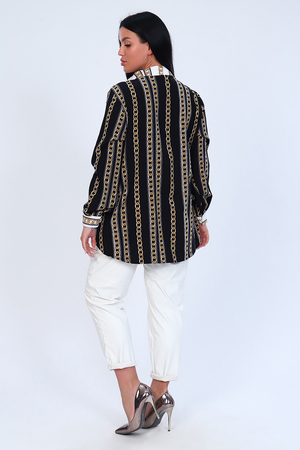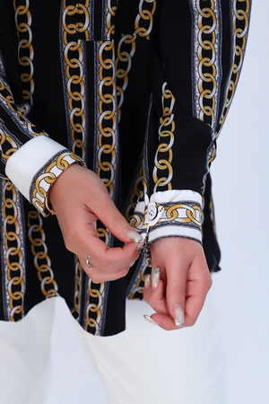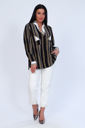 Туника женская прямого силуэта, v-образный воротник, декорирован пуговицами, длинный рукав на манжетах с застежкой на пуговицу, на передней полочке два накладных кармана, декорированные пуговицей. Легкая и удобная.