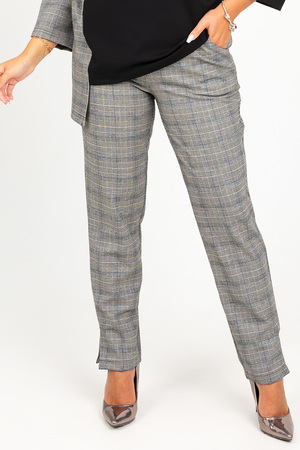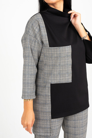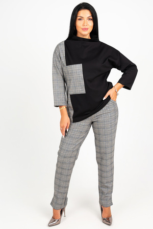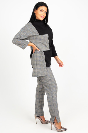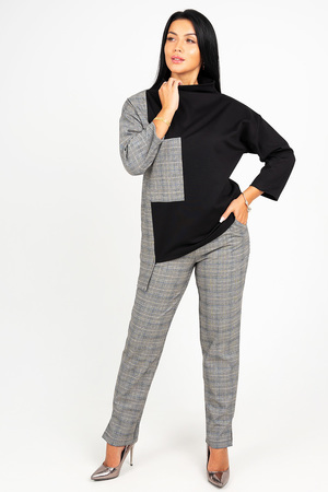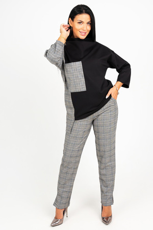Стильный женский брючный костюм из ткани в клетку с отделкой из плотного трикотажа. Кофта свободного силуэта разноуровневой длины, спущенная линия плеча, рукав 3/4, цельнокроенный воротник-стойка и накладной карман на полочке создает яркий современный образ. Брюки с боковыми карманами заужены к низу. Удобный пояс на резинке.