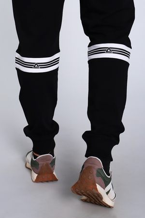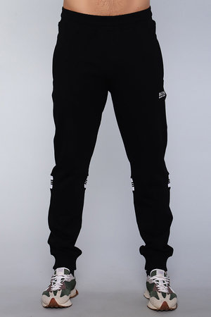 Брюки мужские изготовлены из качественной износоустойчивой ткани, приятной к телу. Изделие прямого кроя заужены к низу на манжете имеет два вместительных боковых врезных кармана на молнии с клапаном. Под карманом слева контрастная буквенная печать. Пояс на резинке дополнен шнурком. Сзади под коленами контрастная вставка с печатью.