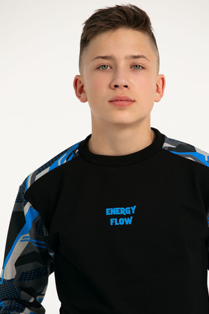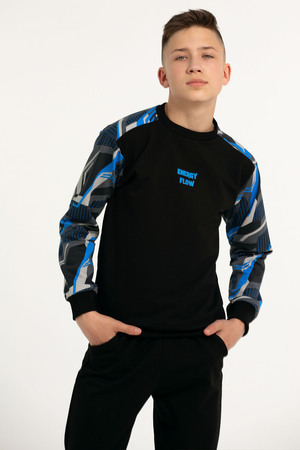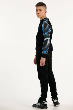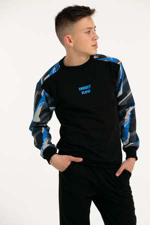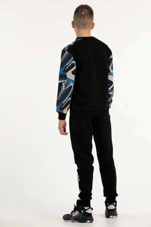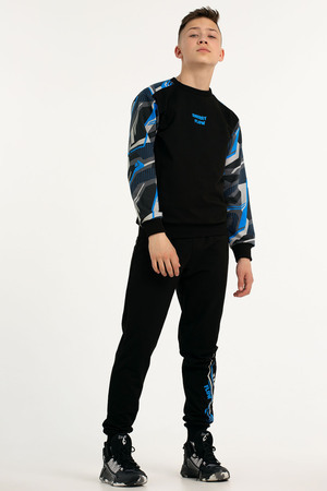 Костюм свободного кроя выполнен из футера 2-х нитки. Состоит из толстовки и брюк. Толстовка с манжетами и поясом из эластичного трикотажа. Рукав втачной со спущенной линией плеча. Брюки свободной посадки с карманами и манжетами из эластичного трикотажа.