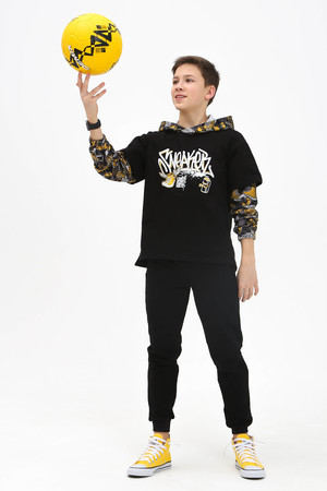 Костюм свободного кроя, выполнен из футера 2-х нитки. Состоит из худи и брюк. Худи с капюшоном и накладным карманом (кенгуру) на полочке. Рукав двойной из ткани с принтом. По низу рукава цельнокроеный манжет с резинкой. Худи с разрезами в боковых швах. Брюки свободной посадки, с эластичным поясом.