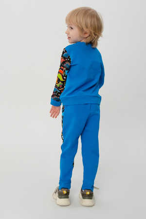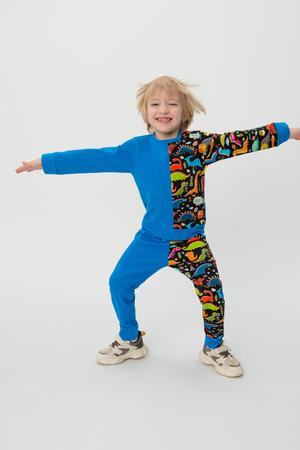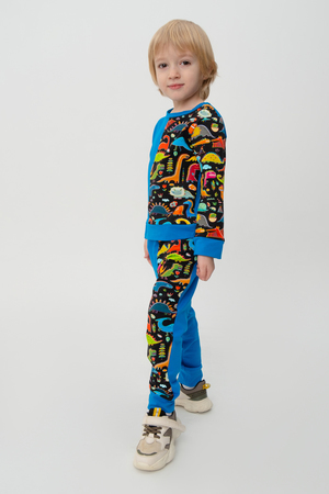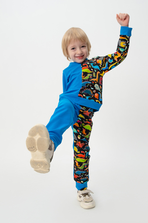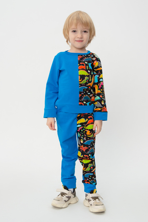 Костюм Дино состоит из свитшота с принтом и брюк. Изделия выполнены из набивного футера, что поможет ребенку не бояться прохладной погоды. Комплект слегка прилегает к телу, не раздражает кожу и легок в уходе. При стирке не деформируется и не пилингуется.
