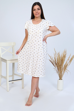 Нежная и лёгкая сорочка свободного кроя с округлой горловиной и коротким рукавом. Комфортная длина миди (чуть ниже колена). Сборка по горловине придаёт изделию свободу и лёгкость в движении. Короткий рукав крыло - изящность силуэту. Обработка подола и рукавов на краеобмёточной машине завершает кокетливый образ.