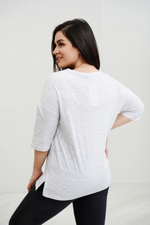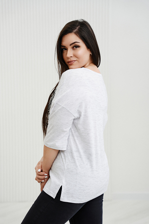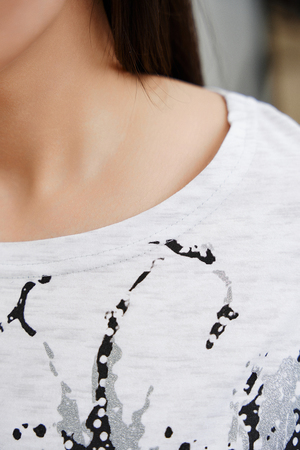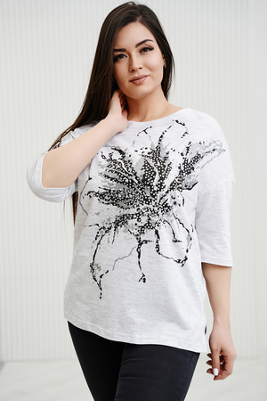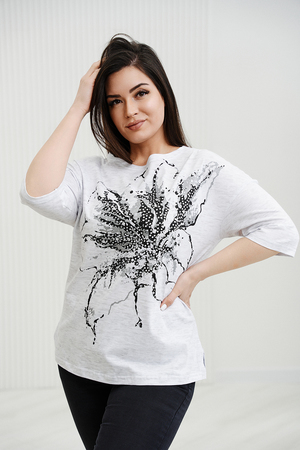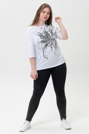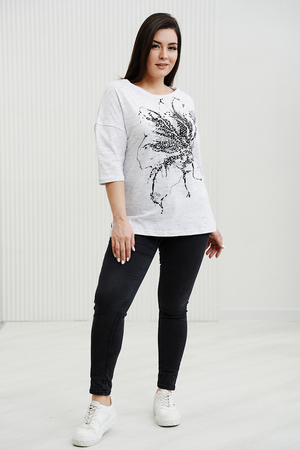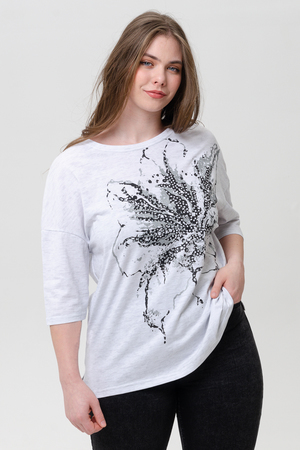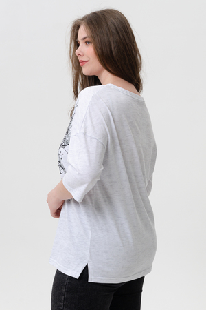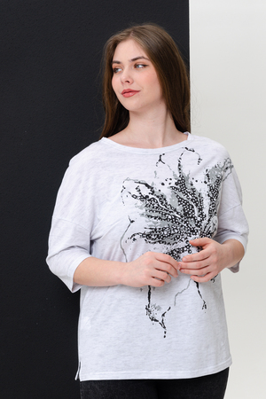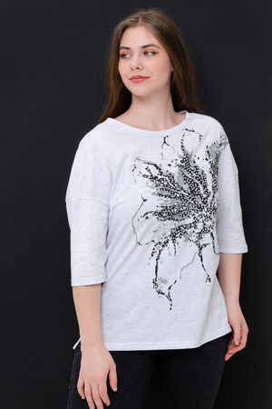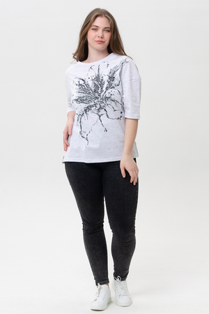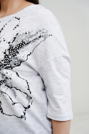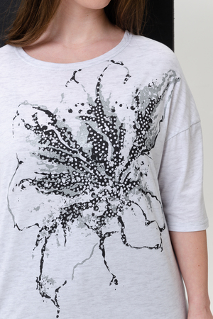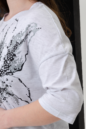 Туника женская, полуприлегающего силуэта, c округлой горловиной, спереди и на рукавах принт. Модель со спущенным рукавом длиной 3/4.