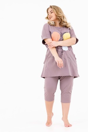 Хлопковый костюм с бриджами от бренда MODALINA состоит из: туники полуприлегающего силуэта с коротким рукавом и прорезными карманами, длина футболки - ниже бедер, горловина округлой формы, с ненавязчивым принтом. Бриджи классической длины с прорезными карманами, с широкой резинкой, которая не передавливает животик.