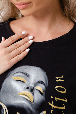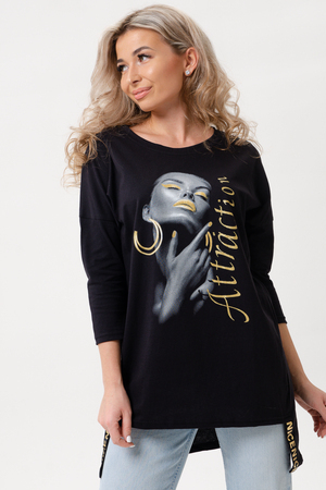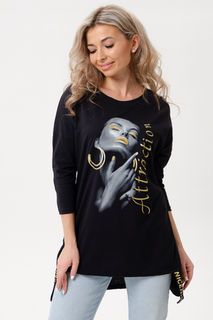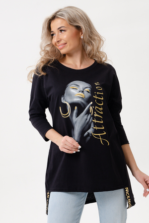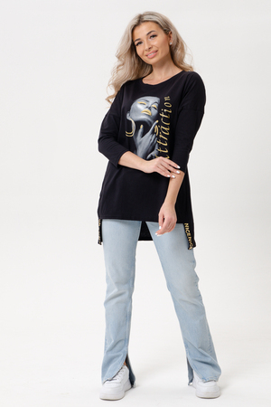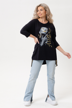 Туника женская. На полочке принт. По низу изделия отделка – тесьма.