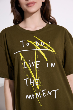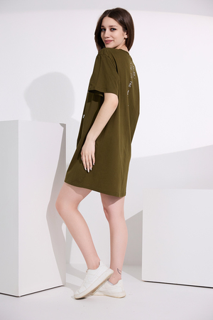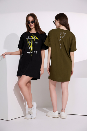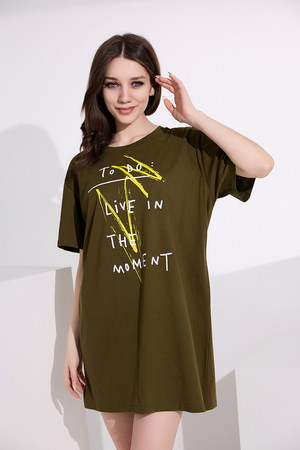 Туника - футболка в стиле "оверсайз". Прямая, свободная, длиной выше колена, с округлой горловиной. Рукав короткий. Горловина обработана обтачкой из основного полотна.