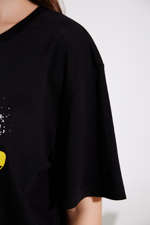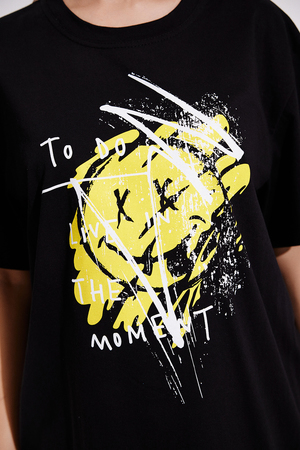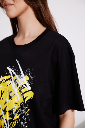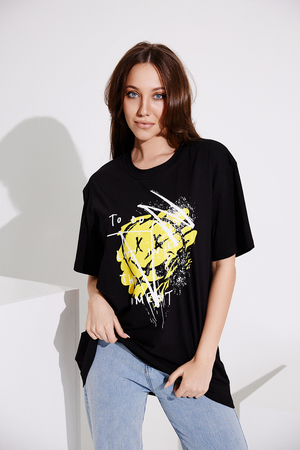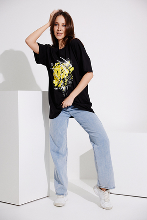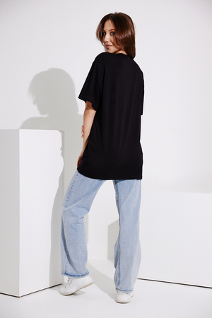 Футболка в стиле "оверсайз". Прямая, свободная, удлиненная, с округлой горловиной. Рукав короткий. Горловина обработана обтачкой из основного полотна.