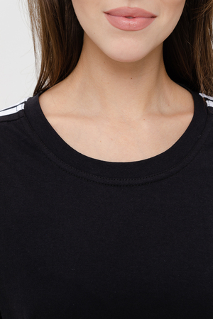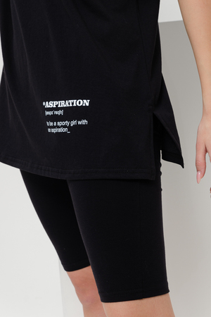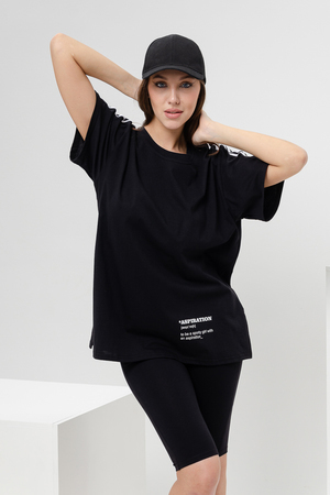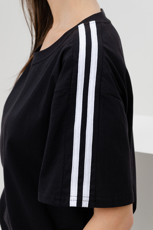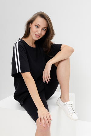 Костюм состоит из футболки и велосипедок. Футболка в стиле "оверсайз". Прямая, свободная, удлиненная, с округлой горловиной. В нижней части боковых швов обработаны разрезы. Рукав короткий. Вдоль плеча и рукава расположена вставка с лампасами контрастного цвета. Горловина обработана обтачкой из основного полотна. Велосипедки-бриджи облегающие, длинной выше колена, сверху на резинке.