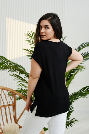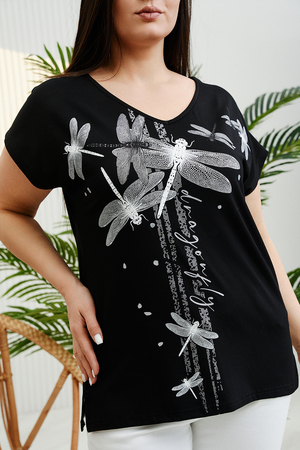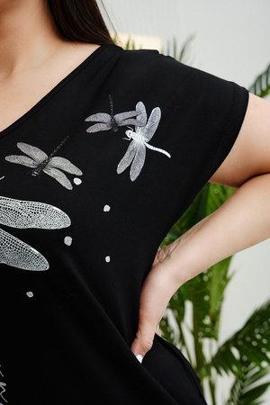 Футболка женская прямого силуэта с разрезами в боковом шве. Y-образный вырез горловины. Рукав цельнокроенный короткий. На полочке стильный принт.
