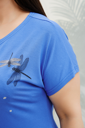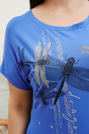 Светлана Александровна08.05.2023 в 13:59Ткань мягкая, На принте серебристые буквы и полоски, а стрекозы - белые. Очень красиво. Платье не сиреневый, а голубое, цвет приятный