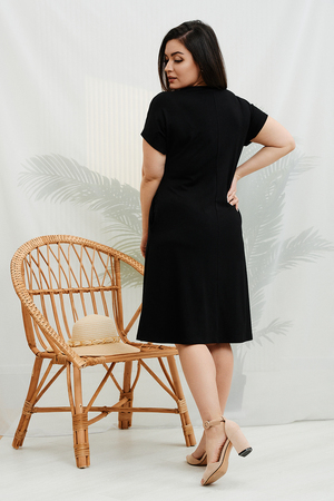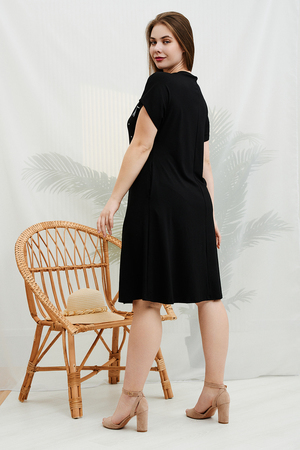 Платье женское полуприлегающего силуэта, слегка расширенное к низу. Рукав цельнокроенный короткий. Горловина округлая. В боковом шве внутренние карманы. На полочке крупный стильный принт.