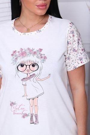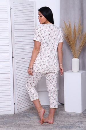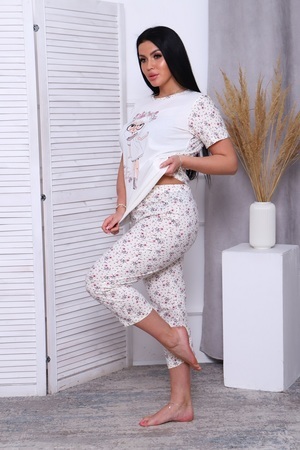 Пижама женская "Весенняя": бриджи и базовая футболка, нежный очаровательный цветочный принт и крупный принт на полочке футболки создают романтичное настроение. Комфортно носить и спать - 100% хлопок.