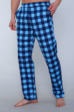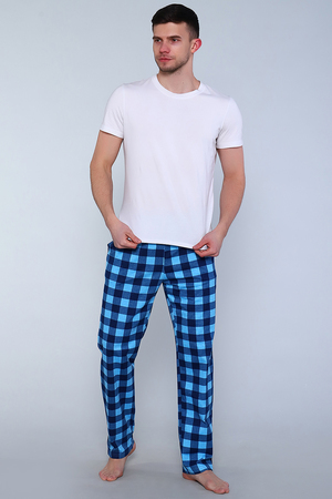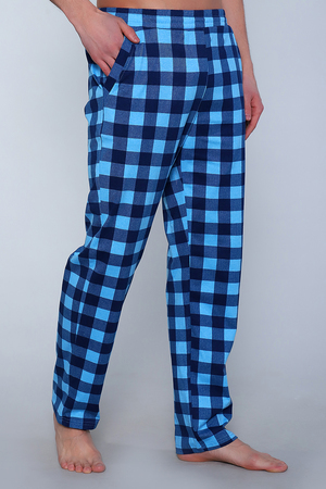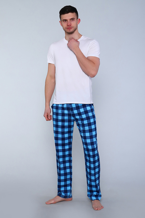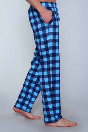 Длинные мужские брюки прямого силуэта на широкой резинке на поясе. Для удобства модель выполнена с боковыми карманами на передних половинках, вход в карман наклонный с декоративной притачной планкой. Пояс с эластичной тесьмой шириной в 4 см выполнен с декоративной отстрочкой на поясной машине. Брюки выполнены из хлопковой трикотажной ткани с принтом в виде "клетки", которая "дышит", в меру эластична, не стесняет движений, очень удобна и комфортна в носке дома, на улице, на природе, на пляже и на занятиях спортом.