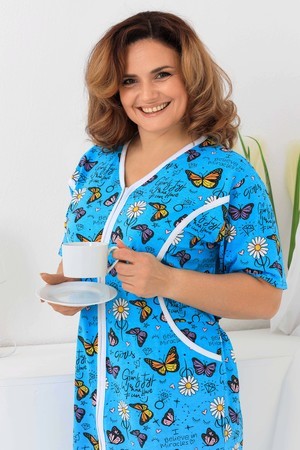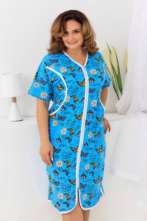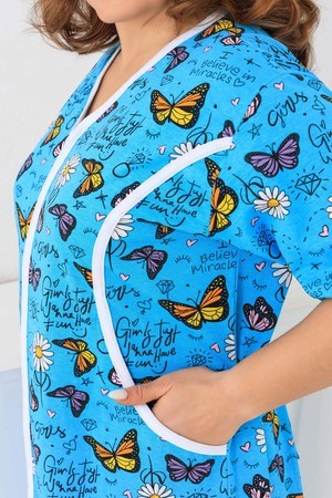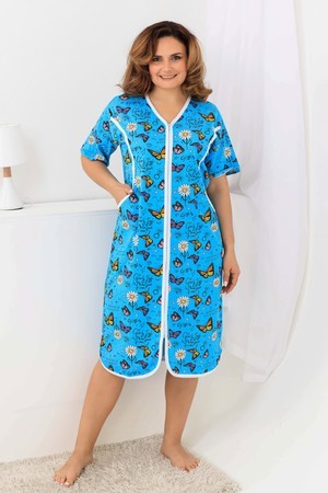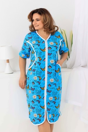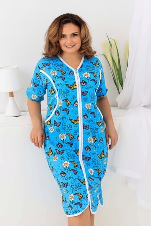 Оригинальный женский халат на молнии. Рукав короткий, боковых швах два полупояса. Спереди на полочке два кармана, рельефы отделаны белым кантом. Ткань 100%хлопок, размерный ряд имеет большие размеры.
